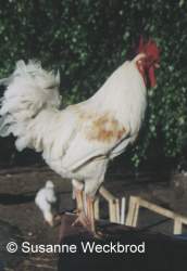 | Abstammung: Sie stammen vom Bankivahuhn, ein Wildhuhn aus Südostasien, ab. Nahrung: Körner, Würmer und Insekten, die sie aus dem Erdboden scharren. | ![]() |