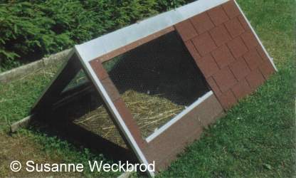 Haltung: Käfig mit Sägemehl, einem Schlafhaus und einer Futterschale,